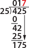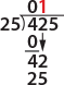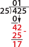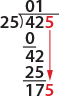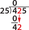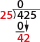 42 ÷ 25 = 1 remainder 17 Bring down the next number of the dividend.