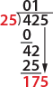 25 × 7 = 175 The answer from the above operation is multiplied by the divisor. The result is placed under the number divided into.