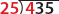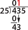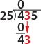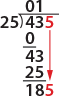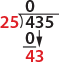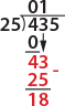 43 ÷ 25 = 1 remainder 18 Divide this number by the divisor.