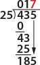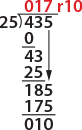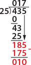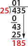 185 ÷ 25 = 7 remainder 10 Divide this number by the divisor.